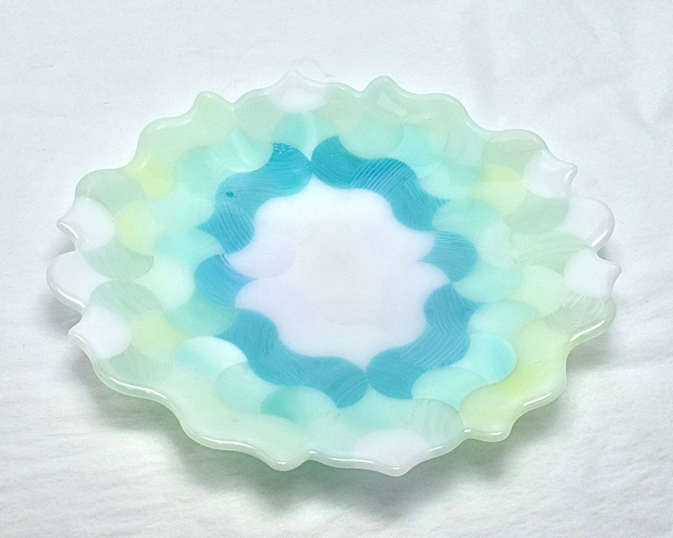 Handcrafted one of a kind glass platter by Jeremy Dane Morris. A brand new design with a handcrafted ‘fan’ motive pattern and a carved ornate edge.